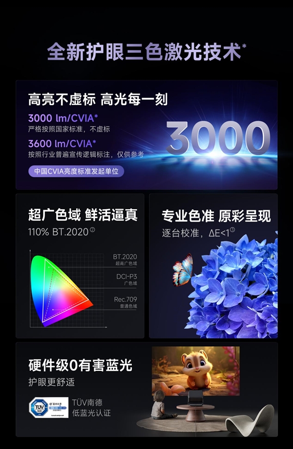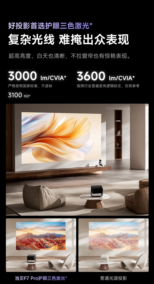 当贝投影正在本年的双11阶段发布了一款全新护眼三色激光投影当贝F7Pro 4K激光投影,正在4K分辩率,取市道上的其他投影设备比拟,当贝F7Pro达到了3600CVIA流明的高亮度,每种颜色都能展示出细腻的条理,